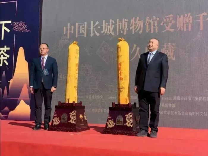 圖為2020年10月,時(shí)任湖南安化縣委書(shū)記劉勇會(huì)向中國(guó)長(zhǎng)城博物館贈(zèng)送白沙溪館藏千兩茶